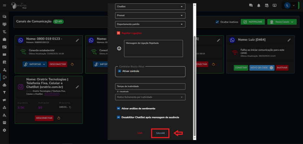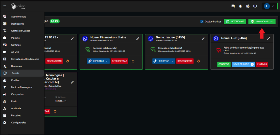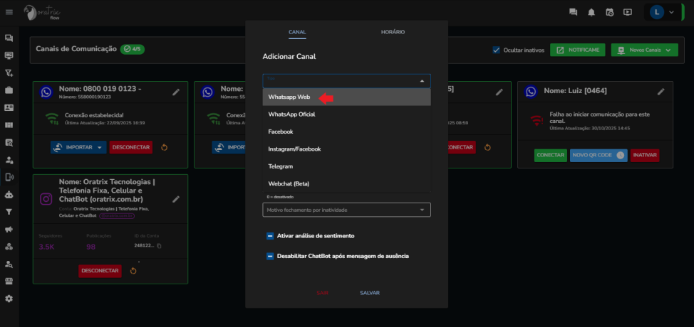 Primeiramente, entre em "Canais" no menu do Chat Oratrix e siga para a opção "Adicionar canal".