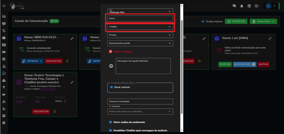 Após, adicione em "Tipo" o "WhatsApp V2". Dê um nome e adicione a opção de ChatBot já criado.