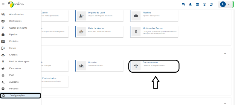 Para criar departamentos basta ir em "Configurações" e selecionar "departamento".